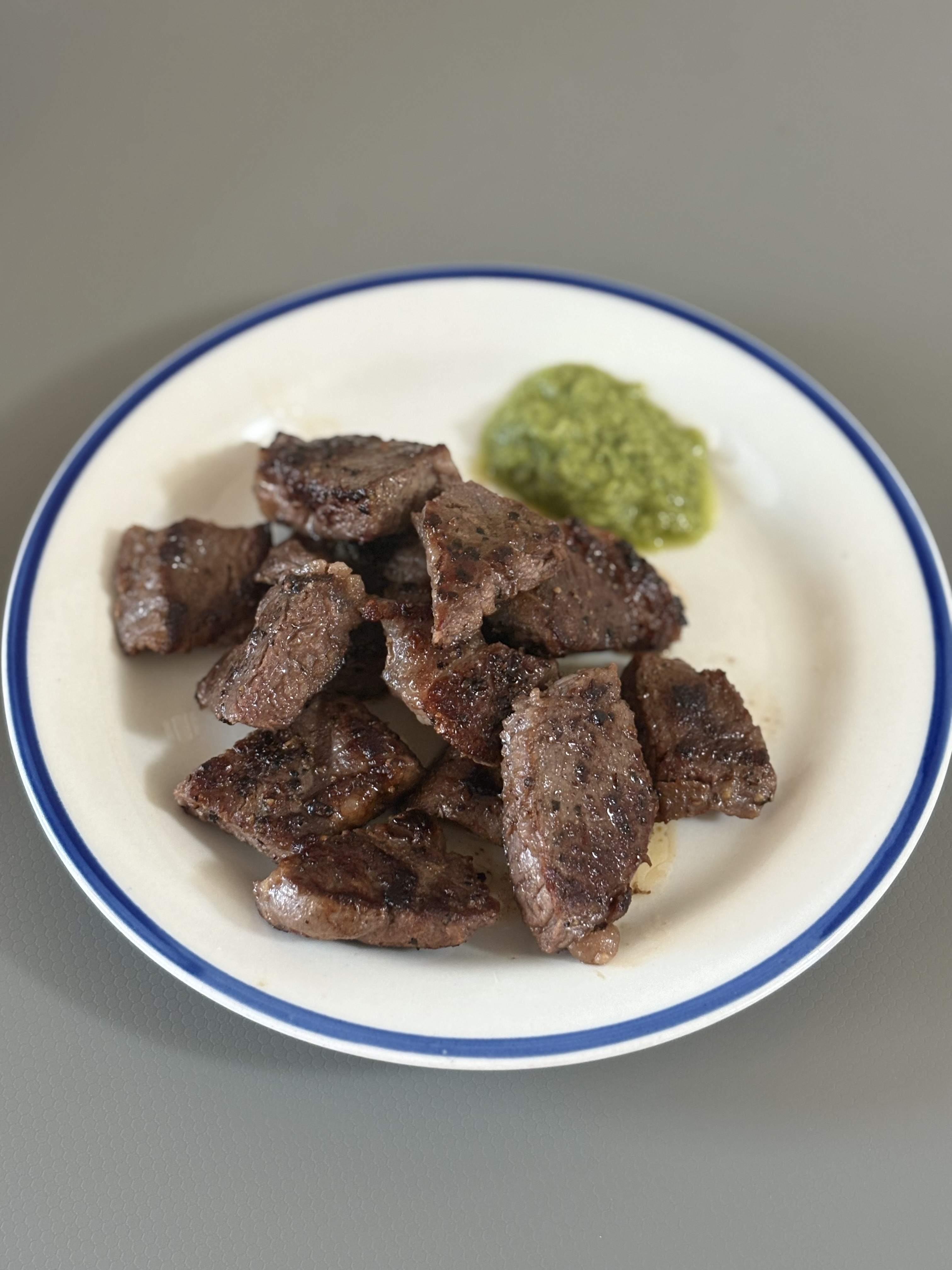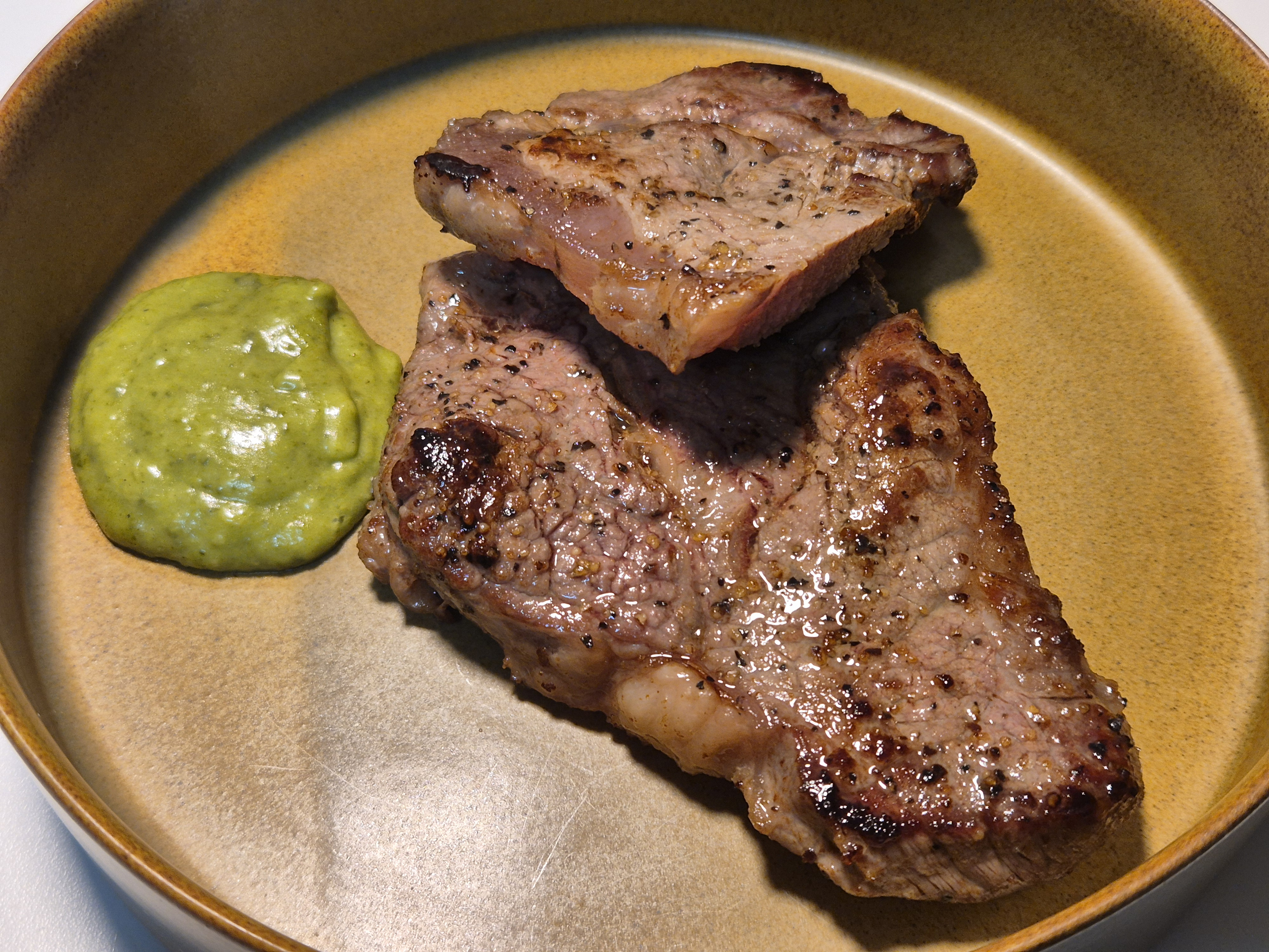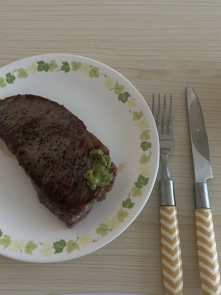 갈색 크러스트가 바싹하게 씹히고, 속은 촉촉한 육즙이 흘러나오며 고소한 향이 퍼지네요. 소금과 후추만으로도 충분한 스테이크의 풍미를 느낄 수 있어서 좋았어요~