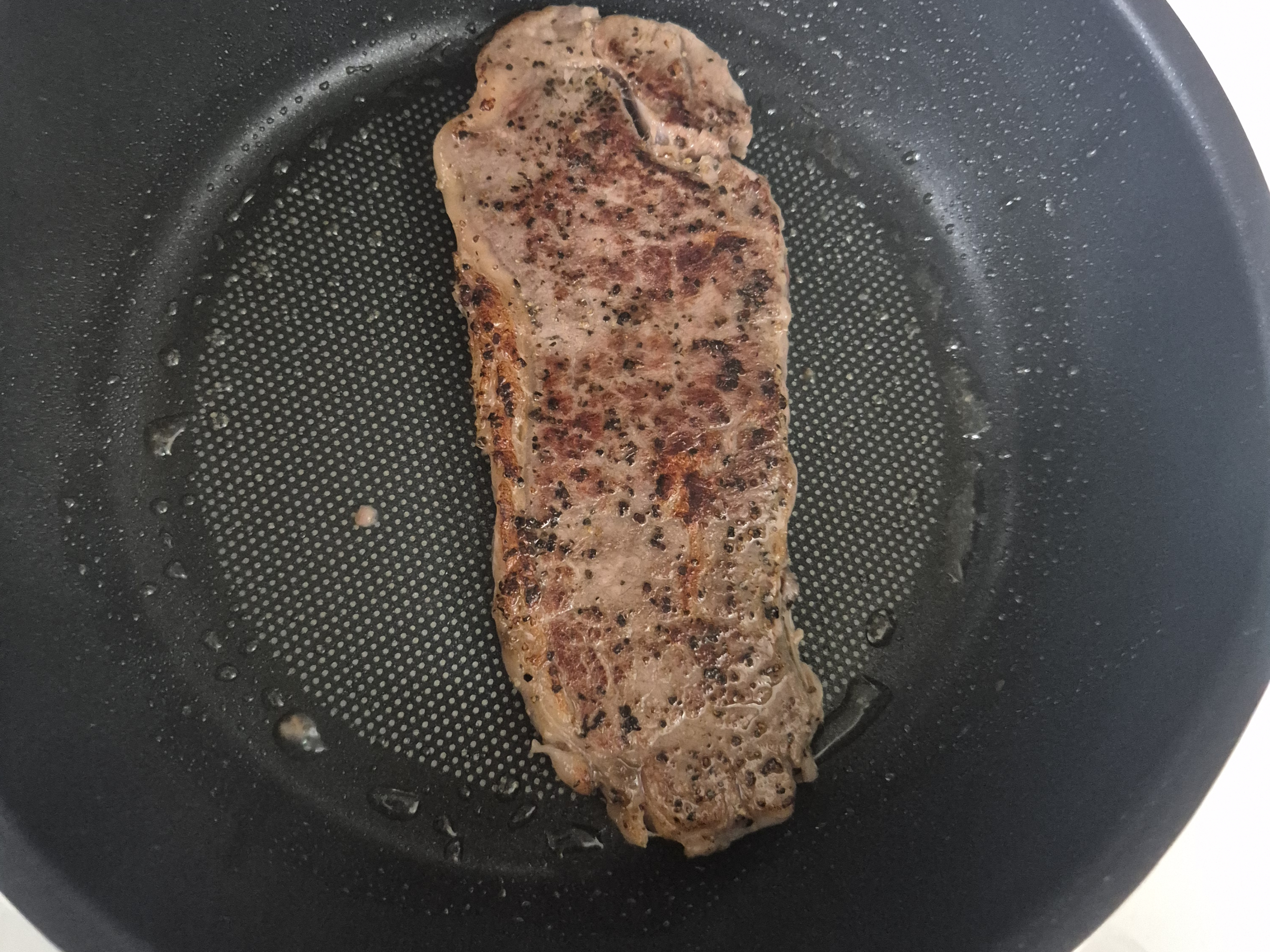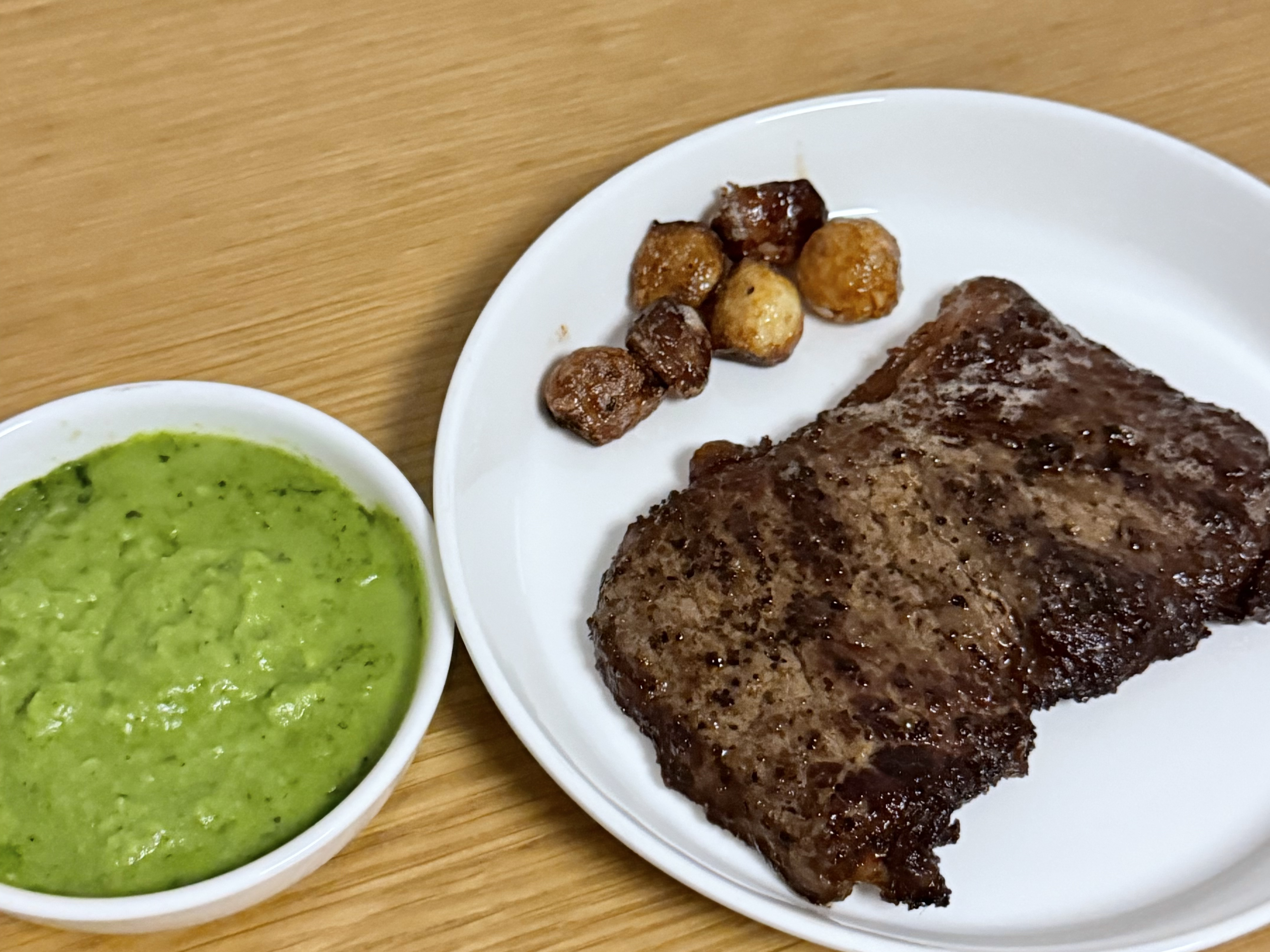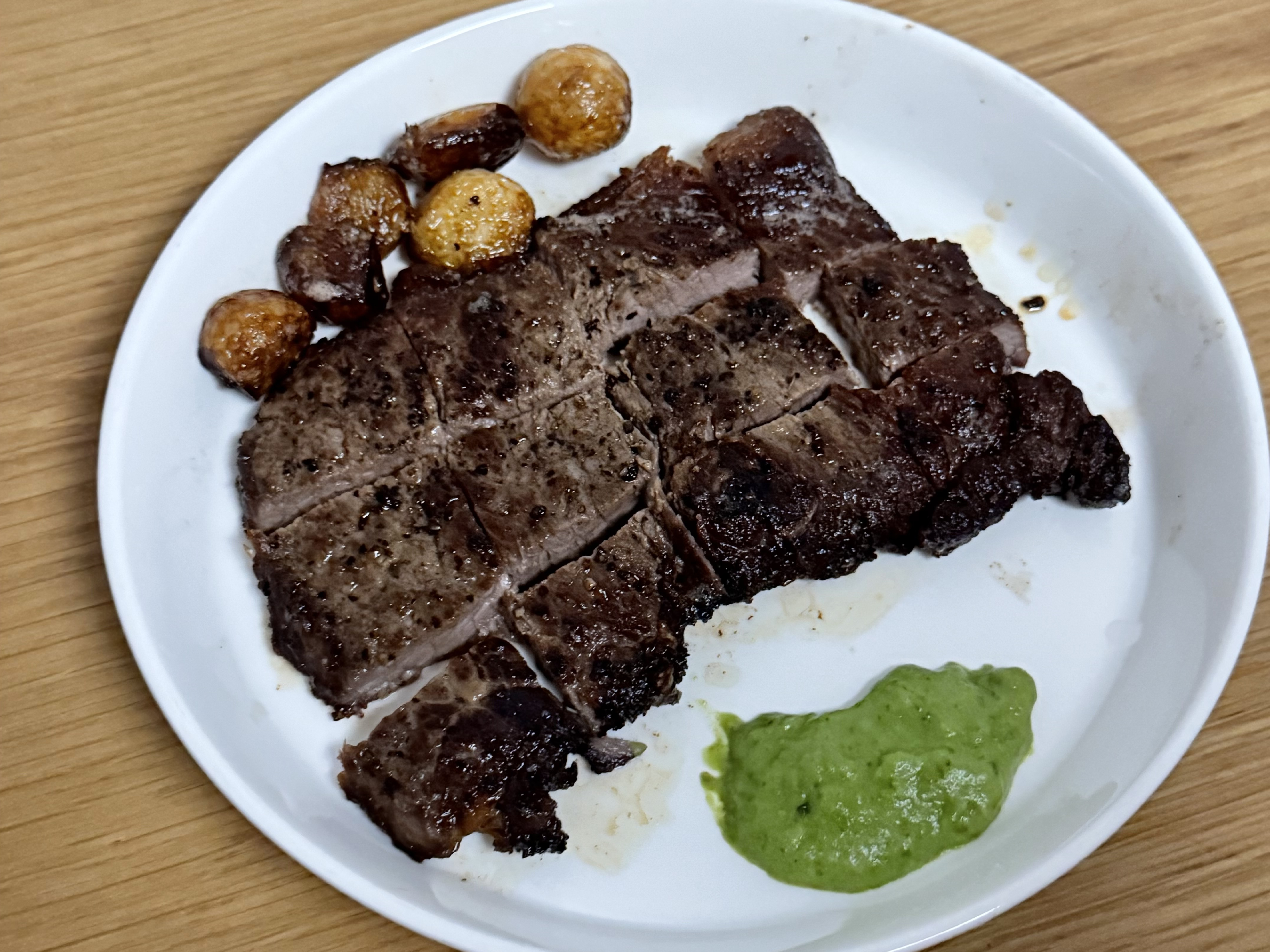 갈색 크러스트가 바싹하게 씹히고, 속은 촉촉한 육즙이 흘러나오며 고소한 향이 퍼지네요. 소금과 후추만으로도 충분한 스테이크의 풍미를 느낄 수 있어서 좋았어요~