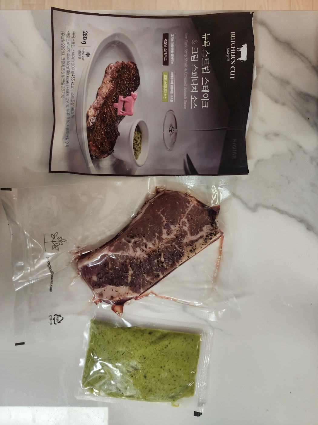 깔끔한 진공 포장으로 고기 색도 좋고 신선했습니다. 밑간이 살짝 되어 있어서 해동하고 바로 굽기만 하면 되서 너무 간편합니다.