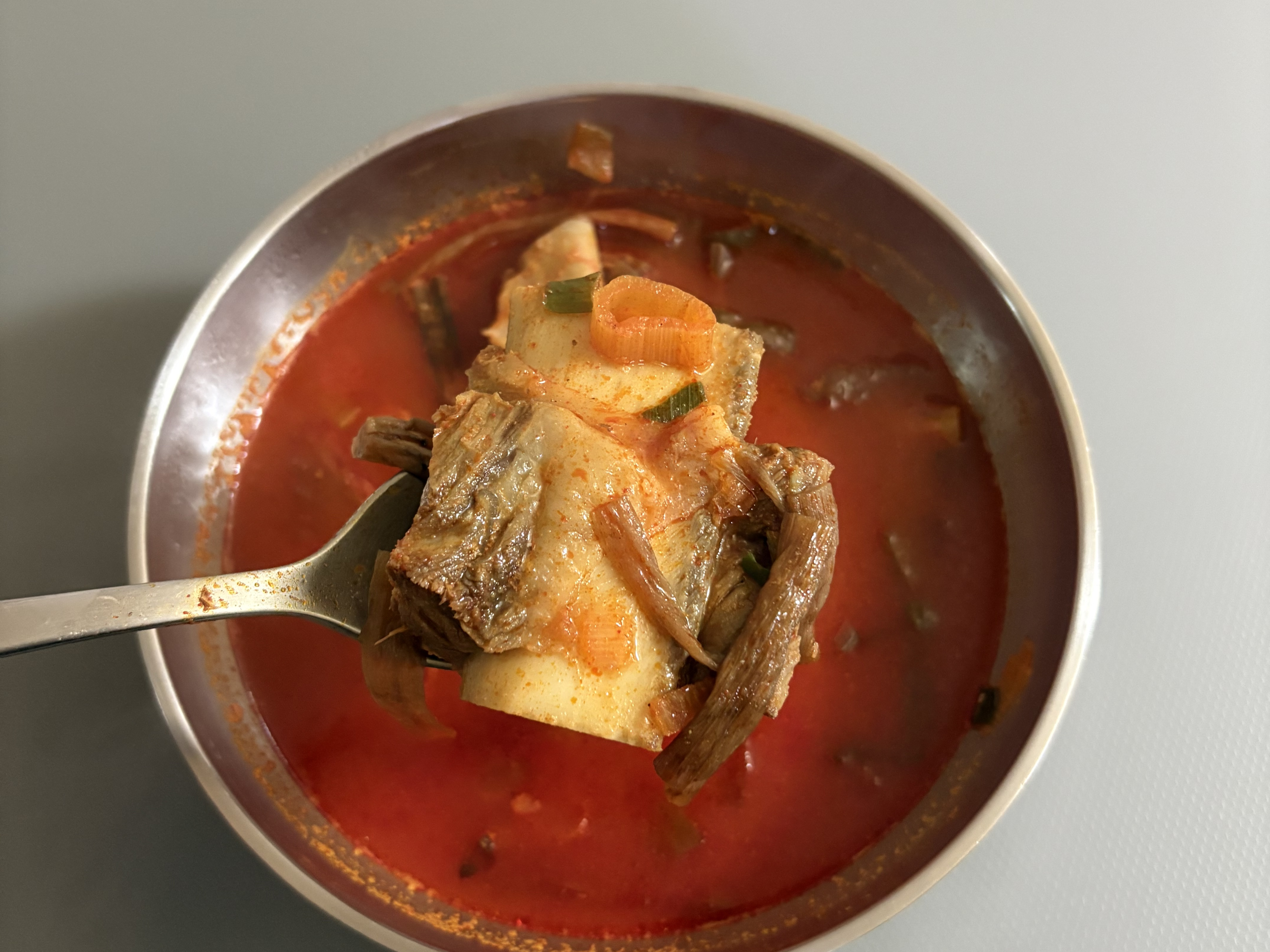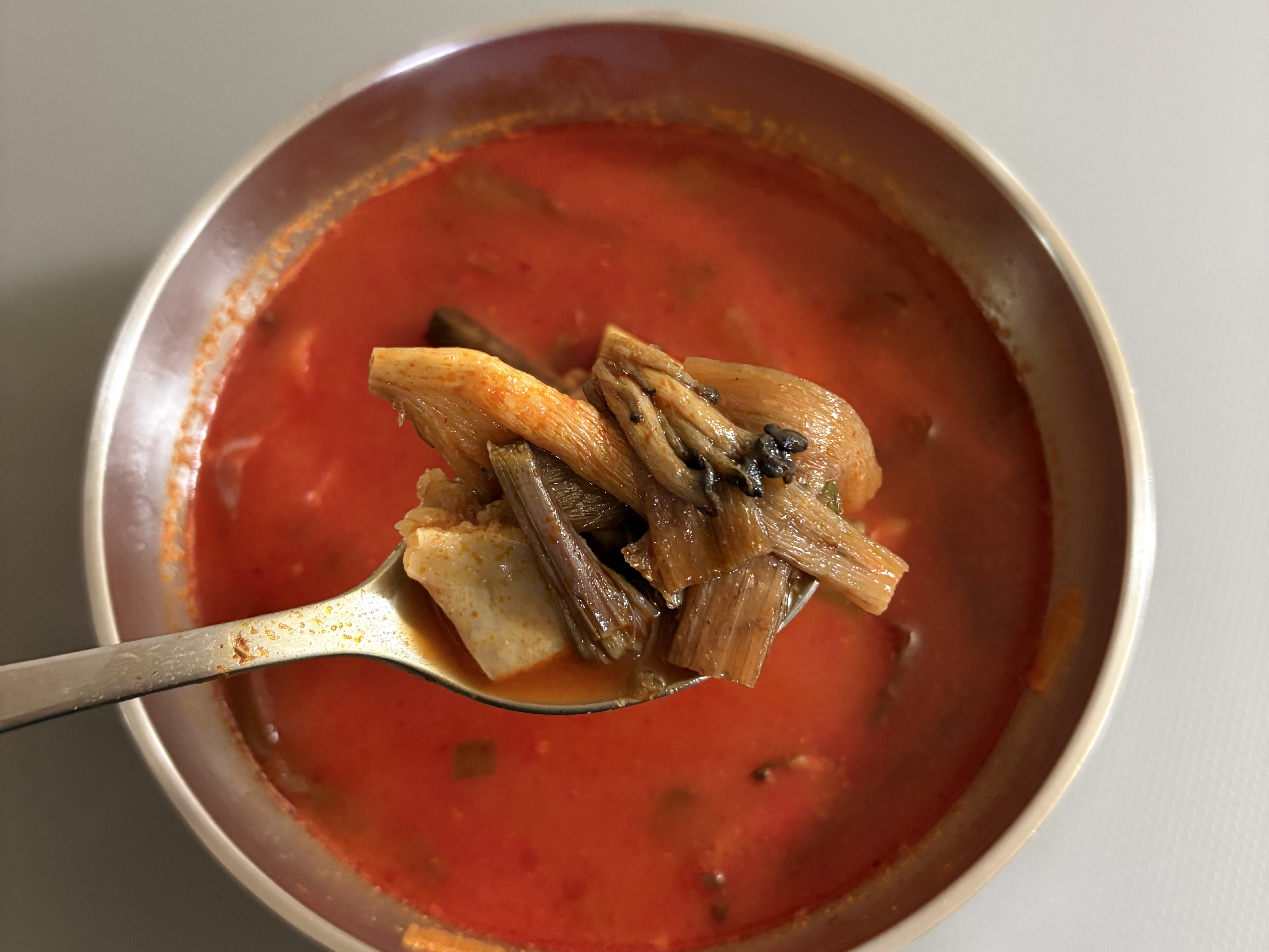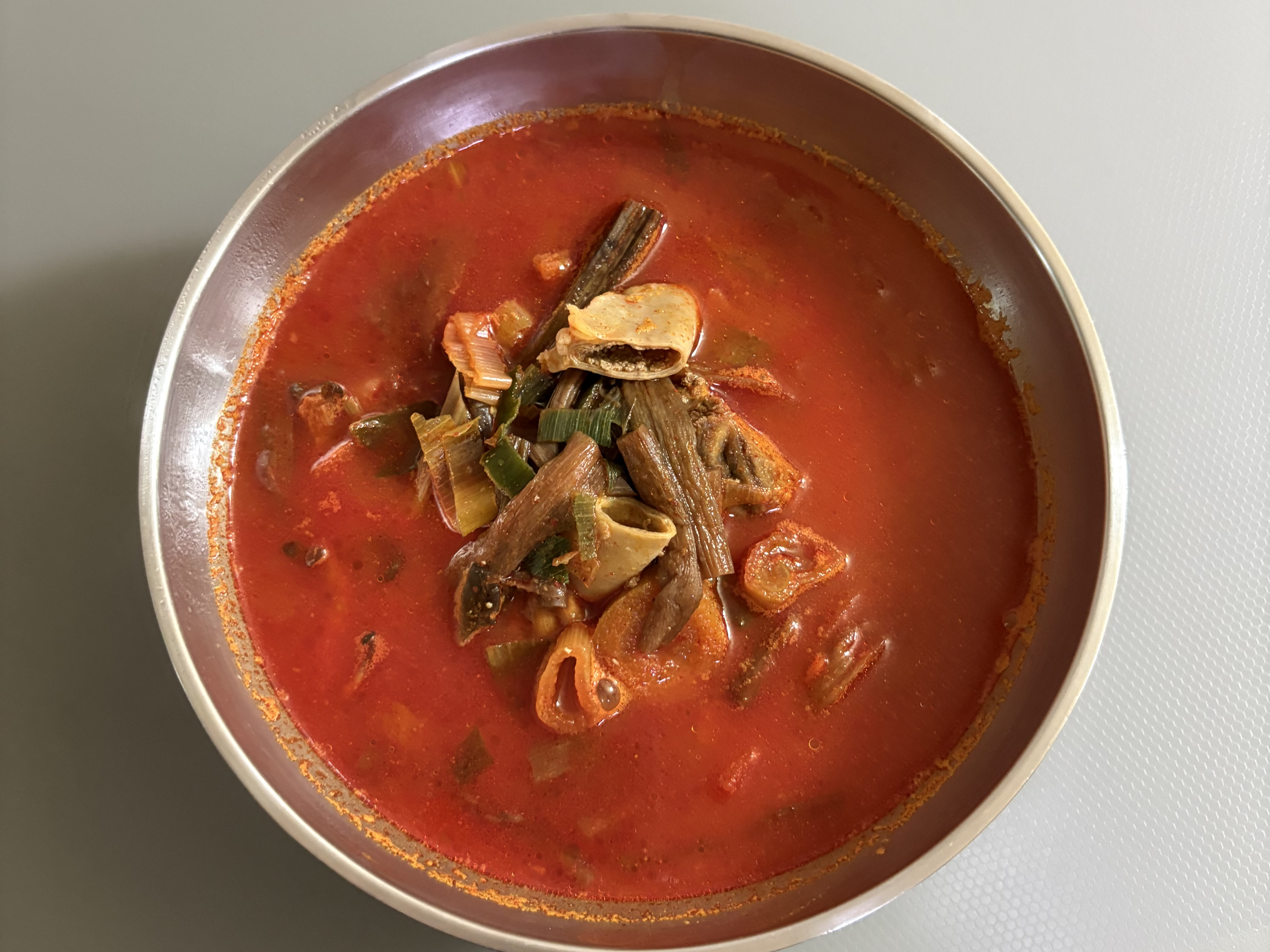 갈빗대도 들어있고 곱창, 버섯, 파, 토란대, 고사리까지 건더기가 진짜 푸짐하게 들어가있어요!! 맵기도 적당하고 해장할때 먹어도 좋을 것 같습니다.